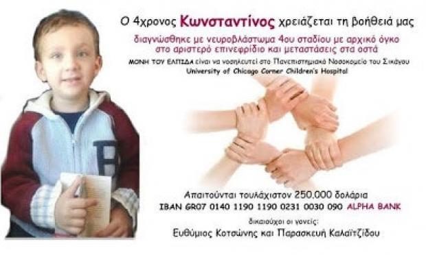 Ο Κωνσταντίνος, που δεν μπορεί να παίζει όπως όλα τα παιδάκια της ηλικίας του, γιατί ασθενεί και είναι αντιμέτωπος με ένα σοβαρό πρόβλημα, δείχνει τόσο γενναίος. Πάσχει από νευροβλάστωμα 4ου σταδίου με αρχικό όγκο στο αριστερό επινεφρίδιο και μεταστάσεις στα οστά και τον μυελό.