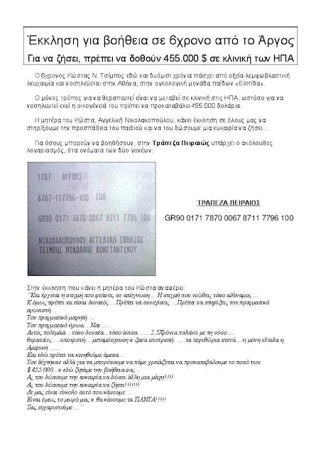 Για όσους μπορούν να βοηθήσουν, στην Τράπεζα Πειραιώς υπάρχει ο ακόλουθος λογαριασμός, στα ονόματα των δύο γονέων: