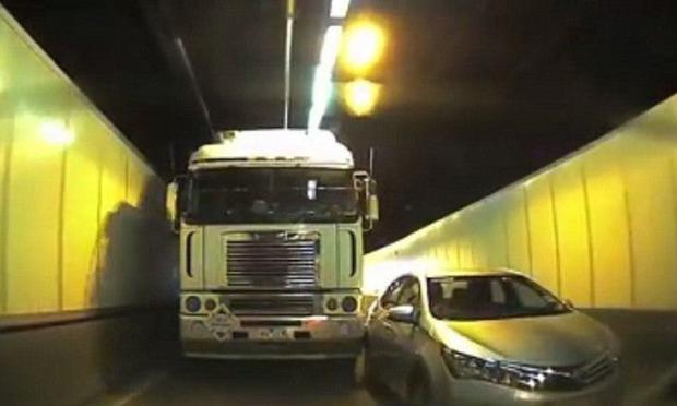 Στο βίντεο που ακολουθεί φαίνονται οι οδηγοί του φορτηγού και του αυτοκινήτου να ανταγωνίζονται για τη λωρίδα κυκλοφορίας, τη μοναδική καθώς το τούνελ στενεύει.