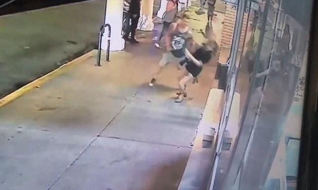 Ο σωματώδης τύπος όπως φαίνεται στο βίντεο, άκουσε τη γυναίκα να του λέει κάτι και γύρισε, της έριξε μία μπουνιά στο πρόσωπο με αποτέλεσμα να πέσει σχεδόν αναίσθητη στο έδαφος.