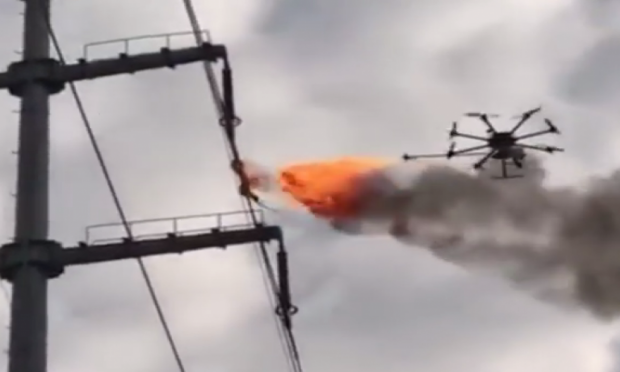 Χρησιμοποιεί drone που πετά φλόγες και έτσι καίει τα σκουπίδια που βρίσκονται πάνω στα καλώδια, στην περιοχή Xiangyang, στην επαρχία Hubei.