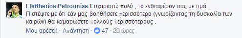 «Ευχαριστώ πολύ, το ενδιαφέρον σας με τιμά. Πιστέψτε με ότι εάν μας βοηθήσετε περισσότερο (γνωρίζοντας τη δυσκολία των καιρών) θα καμαρώσετε πολλούς περισσότερους».