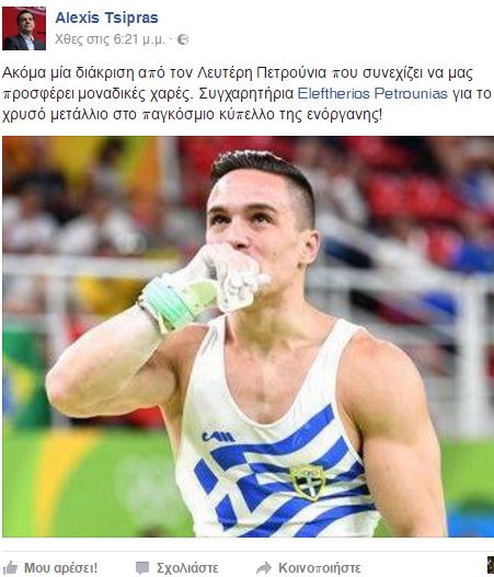 «Διάλογο» μέσω των social media ανέπτυξαν ο πρωθυπουργός Αλέξης Τσίπρας και ο «χρυσός» Ολυμπιονίκης του Ρίο Λευτέρης Πετρούνιας.