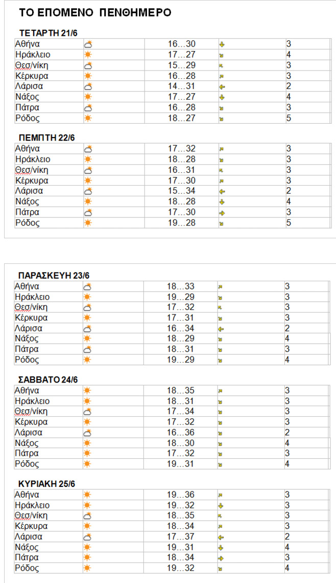 Το τριήμερο από την Τετάρτη έως και την Παρασκευή γενικά δεν προβλέπονται βροχές. Εξαίρεση, ίσως, αποτελέσουν οι ορεινές ηπειρωτικές περιοχές, όπου τα απογεύματα είναι πιθανό να σημειώνονται τοπικές βροχές. Η θερμοκρασία θα σημειώσει βαθμιαία άνοδο. Το τελευταίο σαββατοκύριακο του Ιουνίου σε αντίθεση με τα προηγούμενα σαββατοκύριακα του μήνα, θα είναι καλοκαιρινό με ηλιοφάνεια σχεδόν παντρού και μέγιστες θερμοκρασίες ως τους 37 βαθμούς στα ηπειρωτικά και ως τους 33 βαθμούς στις νησιωτικές περιοχές.