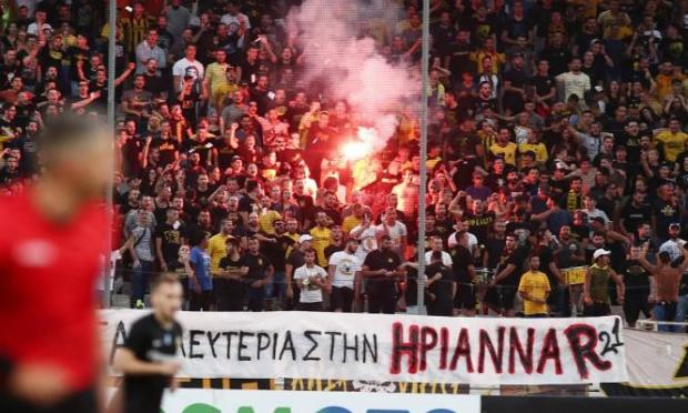 Συγκεκριμένα, στο πέταλο των οργανωμένων οπαδών των «κιτρινόμαυρων» αναρτήθηκε πανό που αναφέρει: «Οι δολοφόνοι έξω, οι αγωνιστές μέσα. Λευτεριά στην Ηριάννα, R21».
