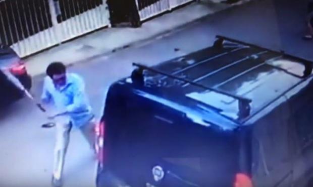 Ο νεαρός φαίνεται να πλησιάζει το “βανάκι” με το ρόπαλο στο χέρι και να το χτυπάει με μανία προκαλώντας σημαντικές φθορές στους καθρέπτες και τα φώτα.