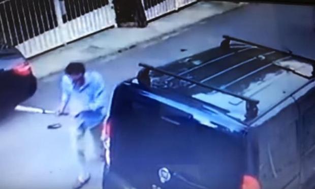 Στο βίντεο φαίνεται ένας άνδρας να κατεβαίνει από ένα τζιπ με ένα ρόπαλο στο χέρι και να σπάει ένα σταθμευμένο όχημα.