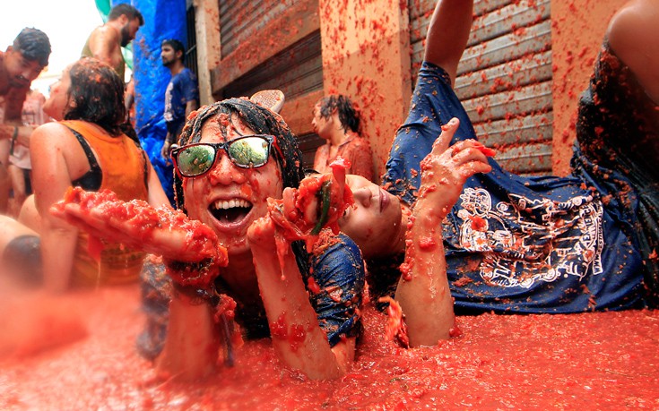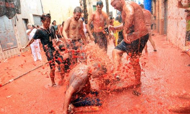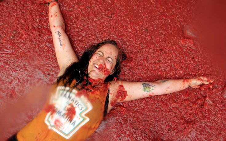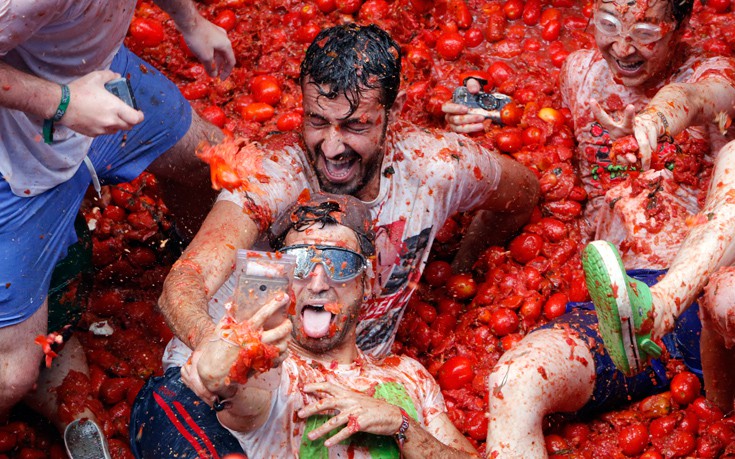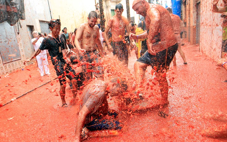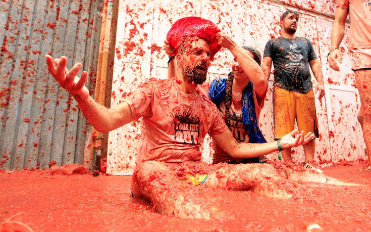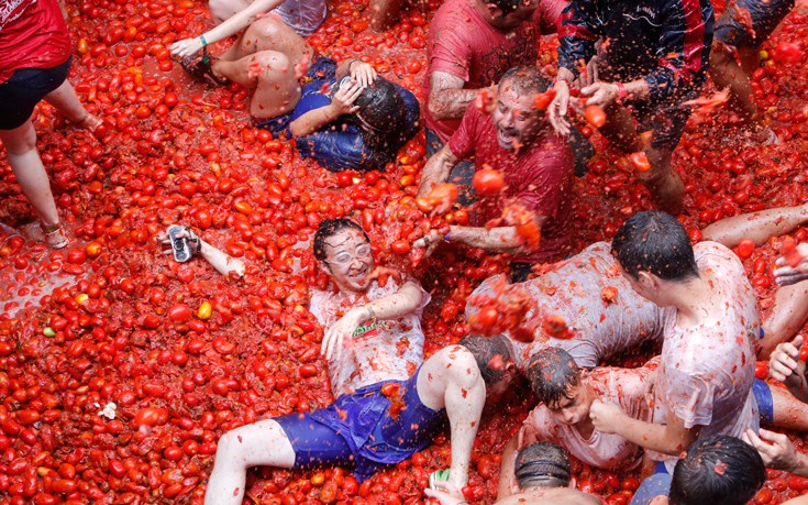 Η «Τοματίνα», που διεκδικεί τον τίτλο της «μεγαλύτερης μάχης με τρόφιμα στον κόσμο» έκλεισε φέτος τα 72 της χρόνια. Οι «μαχητές», ντυμένοι στη μεγάλη πλειονότητά τους με ένα απλό μαγιό και με γυαλιά κολύμβησης, γλέντησαν μέχρι που καλύφθηκαν στο τέλος από ένα παχύ στρώμα κόκκινου πολτού.
