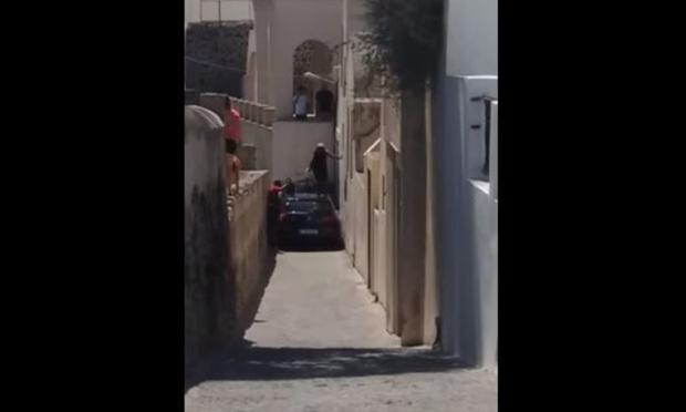 Αυτοκίνητο σφήνωσε σε σοκάκι στη Σαντορίνη και οι πεζοί σκαρφάλωναν για να το περάσουν (βίντεο)
