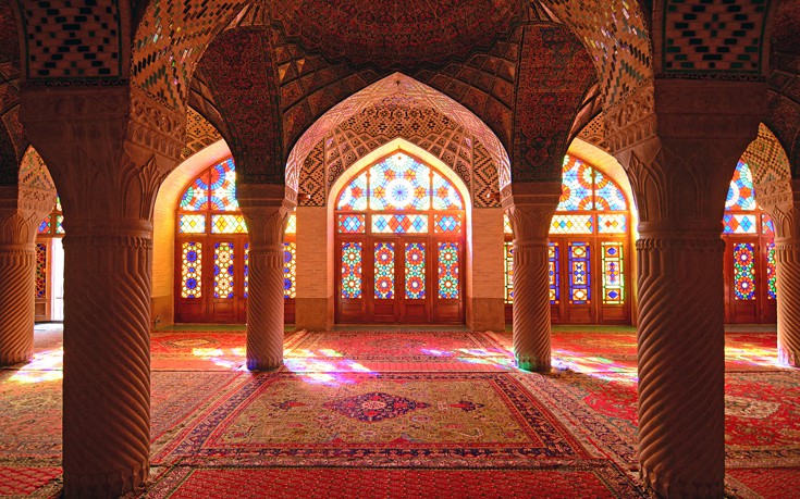 Στο ροζ τζαμί με τη μυστικιστική ατμόσφαιρα, οι δέσμες φωτός διέρχονται μέσω των πολύχρωμων βιτρό χρωματίζοντας εντυπωσιακά το εσωτερικό.