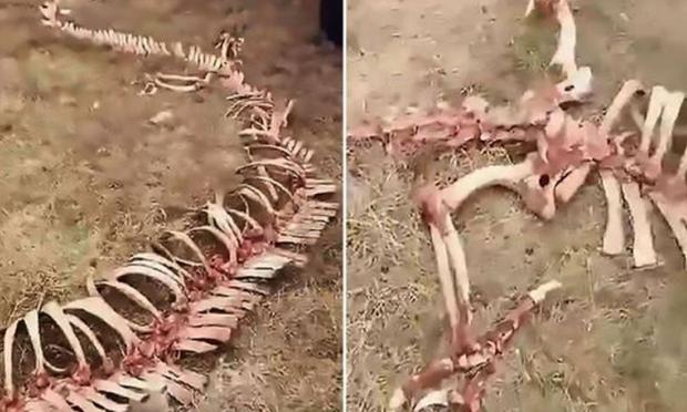 Ο παράξενος «σκελετός», που είχε μήκος τουλάχιστον 18 μέτρα, δύο μικρά «χεράκια» στο κέντρο και κεφάλι που θύμιζε τρομερά... αγελάδα, εντοπίστηκε σε ένα χωριουδάκι κοντά στο Τσανγκζιακού, στα βόρεια της χώρας.