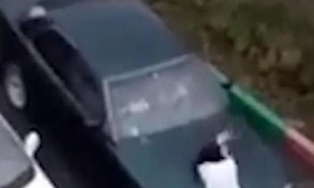 Σε βίντεο που καταγράφηκε από κάμερα κινητού τηλεφώνου ενός αυτόπτη, η 23χρονη «μαινάδα» σπάει τα πλαϊνά παράθυρα προτού προχωρήσει στο παρμπρίζ και μετά στο καπό.