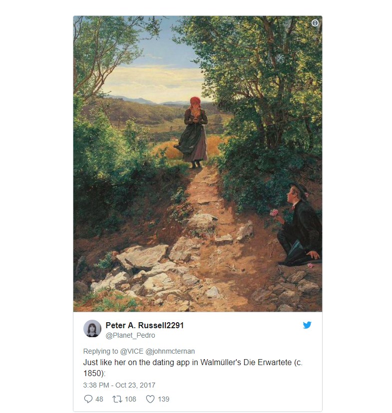 Ασφαλώς, η γυναίκα του πίνακα ούτε στον χρόνο ταξίδεψε, ούτε smartphone κρατάει! Πρόκειται για τον πίνακα «The Expected One», του Ferdinand George Waldmüller και βρίσκεται στη Νέα Πινακοθήκη του Μονάχου. Σύμφωνα με τους υπεύθυνους της πινακοθήκης, η γυναίκα του πίνακα κρατάει στα χέρια της ένα βιβλίο με εκκλησιαστικούς ύμνους! Ωστόσο, ήταν αρκετό ένας χρήστης του Twitter να κοινοποιήσει φωτογραφία του πίνακα με σχόλιο περί … smartphone για να γίνει ο πίνακας viral!