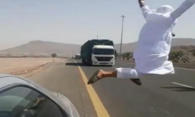 Ένας Σαουδάραβας είχε όρεξη για πλάκα και για… να παίξει την ζωή του κορώνα – γράμματα. Τι έκανε; Αποφάσισε να «πηδήξει» από ένα αυτοκίνητο στη μέση του δρόμου και να αποφύγει κυριολεκτικά στο παρά πέντε μια διερχόμενη νταλίκα.