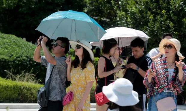 Ασυνήθιστοι στη ζέστη, τουρίστες προφυλάσσονται από τον ήλιο με ομπρέλες