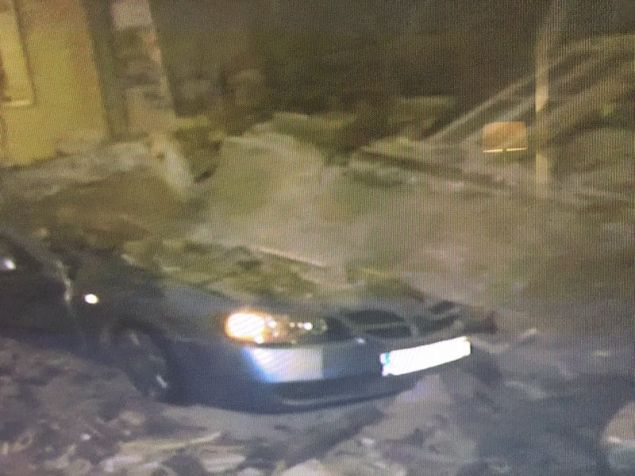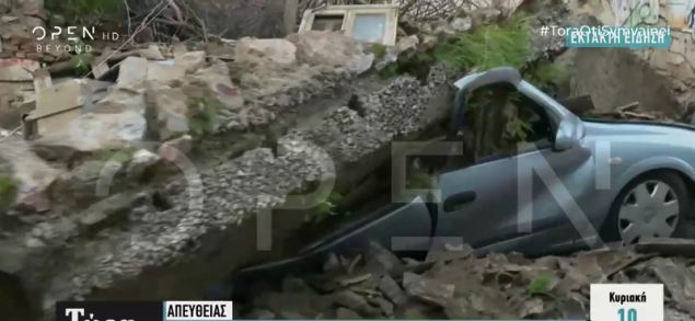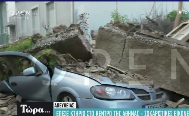 Από την κατάρρευση καταστράφηκαν δύο σταθμευμένα αυτοκίνητα που καλύφθηκαν από τα συντρίμμια.