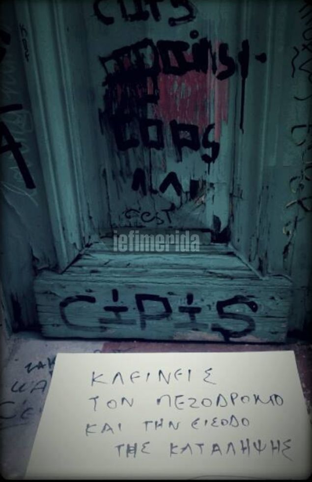 Οι κάτοικοι της περιοχής έκπληκτοι αντίκρισαν μπροστά στην είσοδο της κατάληψης ένα χαρτί που γράφει: «Κλείνεις τον πεζόδρομο και την είσοδο της κατάληψης».