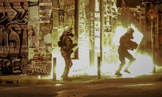Μόλις έφτασαν στο σημείο αστυνομικοί βγήκαν ξαφνικά άτομα από τη Νομική Σχολή και τους επιτέθηκαν με βόμβες μολότοφ, καδρόνια και διάφορα άλλα αντικείμενα.