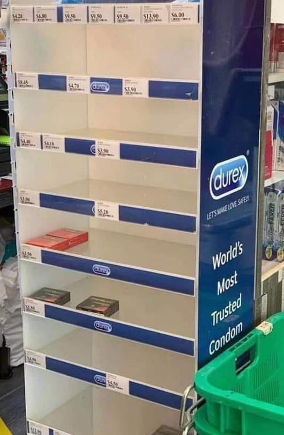 Φωτογραφίες που ανεβάζουν χρήστες των social media από την Αυστραλία και τη Σιγκαπούρη απεικονίζουν τα άδεια από προφυλακτικά ράφια στα σουπερμάρκετ.