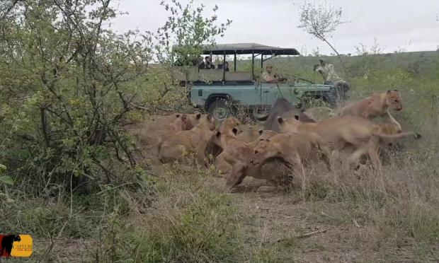 Μια ομάδα ανθρώπων παρακολουθούσαν συγκλονισμένοι, βέβαιοι για την τραγική μοίρα του φυτοφάγου ζώου. Ο βούβαλος ήταν πεσμένος στο έδαφος και 15 λιοντάρια τον είχαν περικυκλώσει.