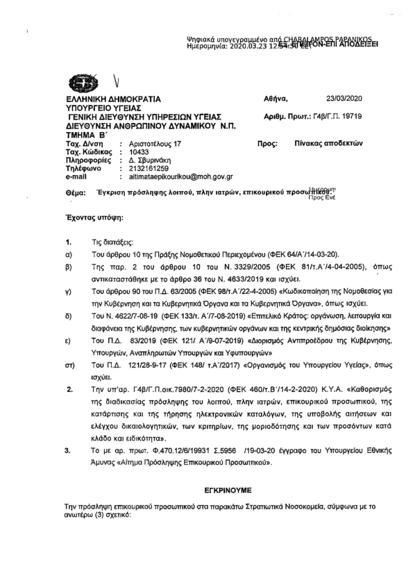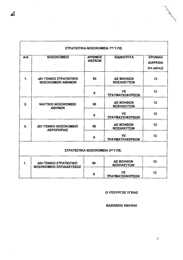 Εγκρίθηκε από τον Υπουργό Υγείας Βασίλη Κικίλια, η πρόταση του Γενικού Γραμματέα του Υπουργείου Εθνικής Άμυνας, Αντώνη Οικονόμου, για την άμεση ενίσχυση με ιατρονοσηλευτικό προσωπικό σε στρατιωτικά νοσοκομεία της χώρας,όπως αναφέρει ο Ηλίας Προύφας στο kranosgr.com