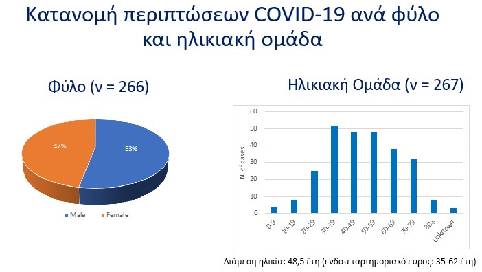 Η διάμεσος ηλικία των περιπτώσεων κορωνοϊού είναι τα 48,5 έτη και το 53% αφορά τους άνδρες.