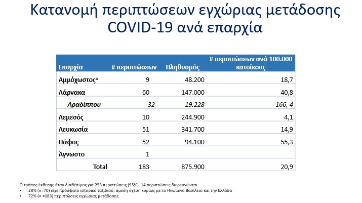 Οι περιπτώσεις εγχώριας μετάδοσης ήταν 183 (69%), εκ των οποίων 37 (20%) είχαν σχέση με το Γενικό Νοσοκομείο Πάφου και 32 (17,5%) καταγράφηκαν στον Δήμο Αραδίππου.