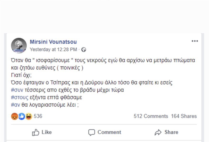 «Όταν θα «ισοφαρίσουμε» τους νεκρούς εγώ θα αρχίσω να μετράω πτώματα και ζητάω ευθύνες (ποινικές). Γιατί όχι; Όσο έφταιγαν ο Τσίπρας και η Δούρου άλλο τόσο θα φταίτε κι εσείς. #συν τέσσερις από χθες το βράδυ #στους εξήντα επτά φθάσαμε #αν θα λογαριαστούμε λέει;».