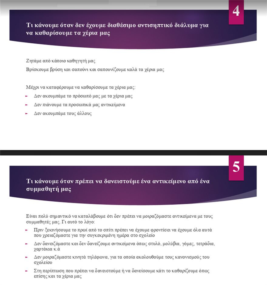Αντίστοιχες οδηγίες περιλαμβάνονται και σε έναν οδηγό 17 σελίδων με εικόνες και επεξηγήσεις για τη συμπεριφορά μέσα στη σχολική μονάδα