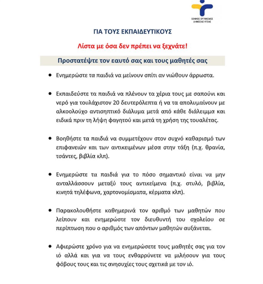 Από τους εκπαιδευτικούς το υπ. Παιδείας ζητά να εκπαιδεύσουν τα παιδιά να πλένουν τα χέρια τους, να μην ανταλλάσσουν αντικείμενα και να συμμετέχουν στον καθαρισμό επιφανειών και αντικειμένων.