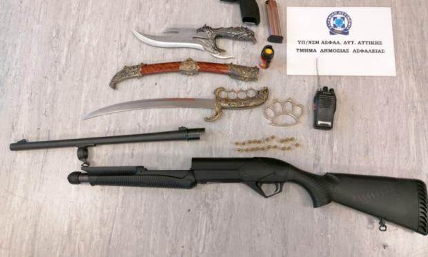 Κατά την διάρκεια δύο κατ' οίκον ερευνών εντοπίστηκαν και κατασχέθηκαν μια καραμπίνα, ένα πιστόλι, 20 φυσίγγια, μαχαίρι, σπαθί, ένας ασύρματος, μια σιδερογροθιά και ένα σπρέι πιπεριού.
