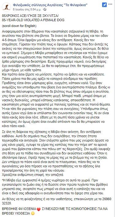 Οργή και αποτροπιασμό προκαλεί η καταγγελία του Φιλοζωικού Συλλόγου Αιγιάλειας, "Τα φιλαράκια" για έναν ηλικιωμένο, περίπου 85 ετών, που φέρεται να κακοποίησε σεξουαλικά μια σκυλίτσα σε ορεινό χωριό της Αιγιάλειας, κοντά στις Νεραντζιές. Σύμφωνα με την καταγγελία, το περιστατικό σημειώθηκε σε δημόσιο χώρο, μπροστά στα μάτια περαστικών, οι οποίοι όμως δεν αντέδρασαν.