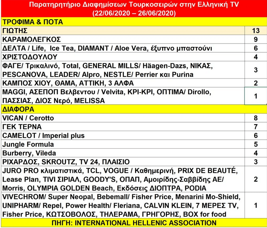 Οι εταιρίες που δαπάνησαν χρήματα για να διαφημίσουν τα προϊόντα τους ήταν 90, έναντι 116 της αμέσως προηγούμενης εβδομάδος 15-19 Ιουνίου 2020. Από τις 90 εταιρίες που διαφημίστηκαν την εβδομάδα 22-26 Ιουνίου 2020, 56 Εταιρίες διαφημίστηκαν μία η δύο φορές ολόκληρη την εβδομάδα, ενώ δύο αναδείχτηκαν «Χρυσοί Χορηγοί» της εβδομάδος με 12 ή περισσότερα διαφημιστικά μηνύματα σε τουρκικές σειρές της ελληνικής τηλεόρασης.