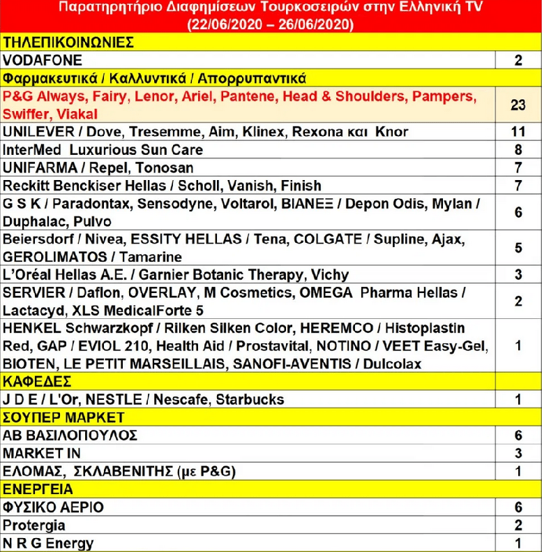 Η μία, με 23 διαφημιστικά μηνύματα, είναι η γιγαντιαία πολυεθνική Procter & Gamble η οποία το 2011 καταδικάστηκε από την Ευρωπαϊκή Επιτροπή Ανταγωνισμού σε πρόστιμο ύψους 211,2 εκ. Ευρώ για πρακτικές χειραγώγησης των τιμών σε απορρυπαντικά προϊόντα σε οκτώ χώρες, μεταξύ των οποίων και η Ελλάδα.