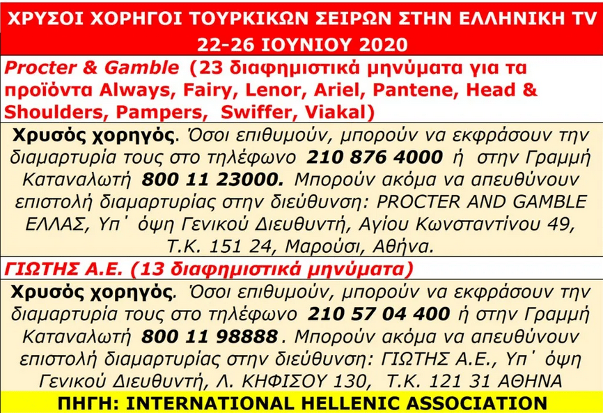 Το International Hellenic Association, ένας μη κερδοσκοπικός, μη κυβερνητικός και μη κομματικός οργανισμός, ο οποίος έχει δημιουργήσει το Παρατηρητήριο Διαφημίσεων Τουρκοσειρών στην Ελληνική Τηλεόραση κάνει και πάλι έκκληση σε όσες εταιρίες διαφημίζουν ακόμα τα προϊόντα τους μέσα από τις τουρκικές σειρές των καναλιών STAR και SKAI, να δώσουν οδηγίες στις διαφημιστικές τους εταιρίες ώστε να εξαιρούν από την προβολή των διαφημιστικών τους μηνυμάτων τις δύο τουρκικές σειρές που μεταδίδονται από την ελληνική τηλεόραση.