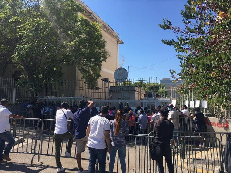 Δεκάδες πρόσφυγες και μετανάστες περιμένουν να καταθέσουν τα χαρτιά τους στην υπηρεσία.