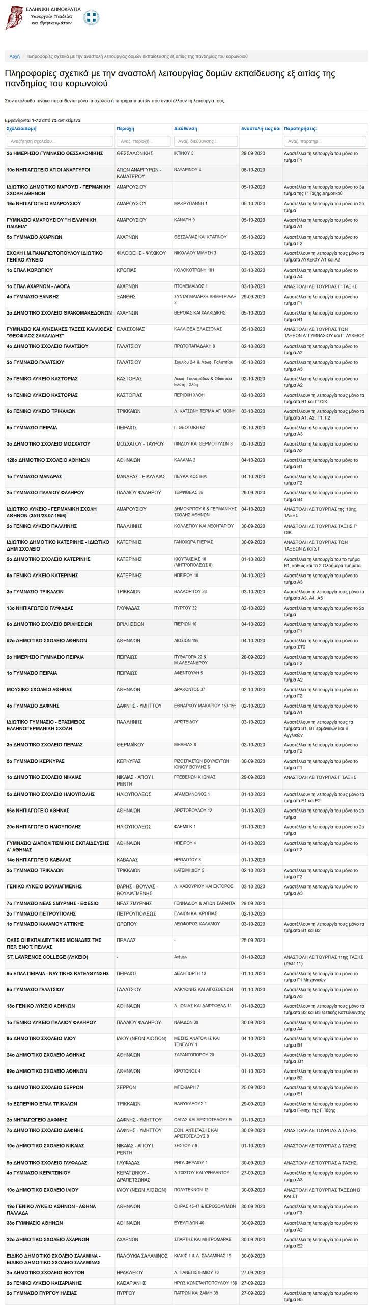 Σύμφωνα με την ανακοίνωση του υπουργείου Παιδείας τα σχολεία ή τμήματα που έχουν βάλει λουκέτο είναι τα εξής:
