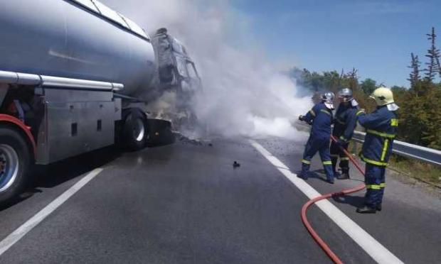 Η φωτιά φαίνεται να ξέσπασε στην μηχανή του βυτιοφόρου, το οποίο και υπέστη ζημιές.