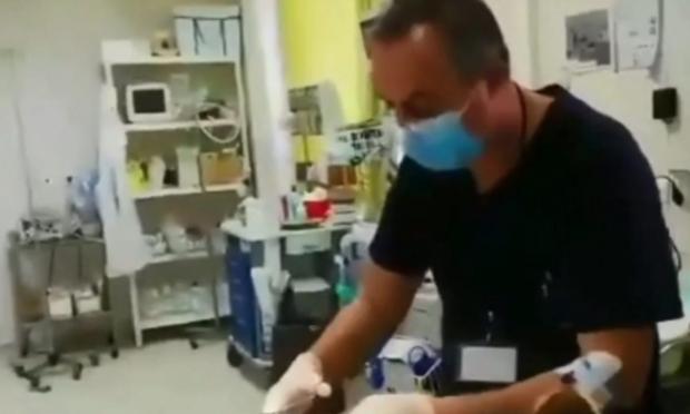 Στο Βενιζέλειο νοσοκομείο, στο Ηράκλειο στην Κρήτη, ένας γιατρός πιστός στο λειτούργημά του πρόσφερε τις υπηρεσίες του ενώ ο ίδιος υπέφερε από πόνους και είχε ορό στο χέρι.