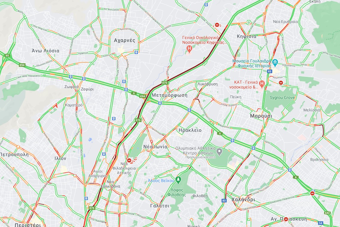 Η εικόνα με τα ακινητοποιημένα αυτοκίνητα θυμίζει εποχές προ καραντίνας, όταν προπαραμονή Χριστουγέννων κεντρικές οδικές αρτηρίες του Λεκανοπεδίου είχαν πολύ αυξημένη κίνηση.