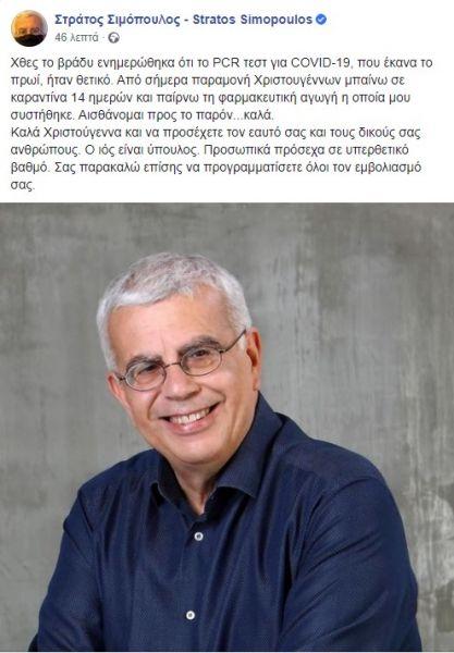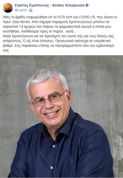 «Χθες το βράδυ ενημερώθηκα ότι το PCR τεστ για COVID-19, που έκανα το πρωί, ήταν θετικό. Από σήμερα παραμονή Χριστουγέννων μπαίνω σε καραντίνα 14 ημερών και παίρνω τη φαρμακευτική αγωγή η οποία μου συστήθηκε. Αισθάνομαι προς το παρόν…καλά.