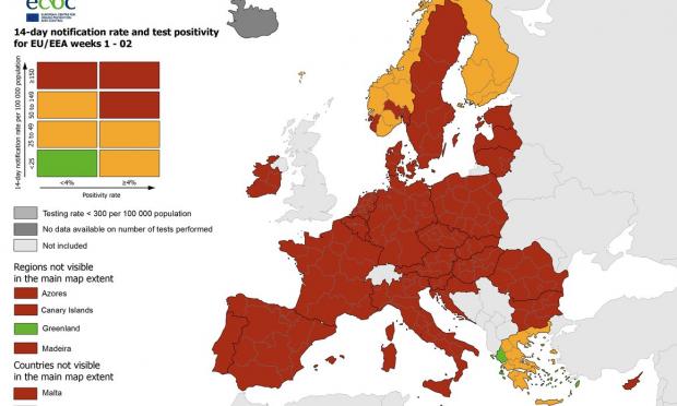 Στο «κόκκινο», σε ότι αφορά τα κρούσματα κορωνοϊού, βρίσκεται σχεδόν ολόκληρη η Ευρώπη, σύμφωνα με τον εβδομαδιαίο χάρτη που δημοσιοποίησε σήμερα το Ευρωπαϊκό Κέντρο Ελέγχου και Πρόληψης Ασθενειών (ECDC).
