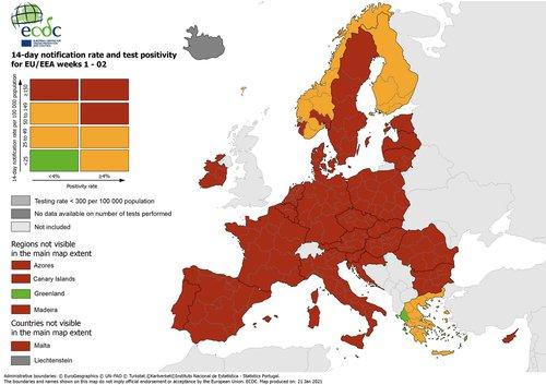 Στο «πράσινο» βρίσκεται επίσης ολόκληρη η Ελλάδα όσον αφορά τον παρακάτω χάρτη με το δείκτη θετικότητας, με το μεγαλύτερο μέρος της Ευρώπης να παραμένει στο «κίτρινο».