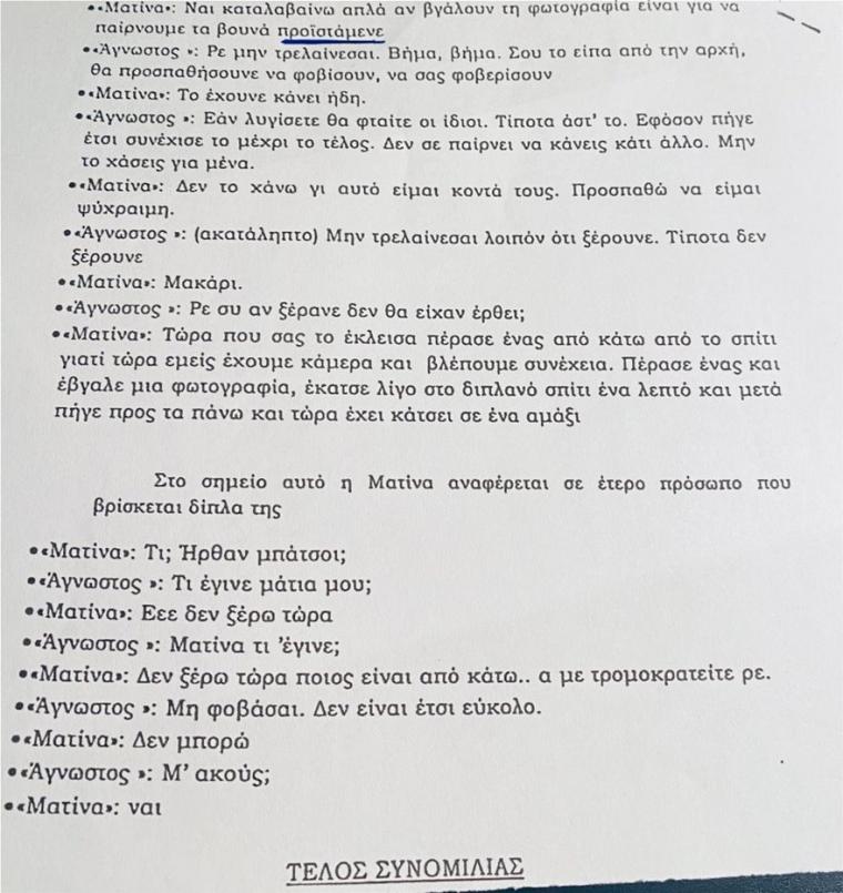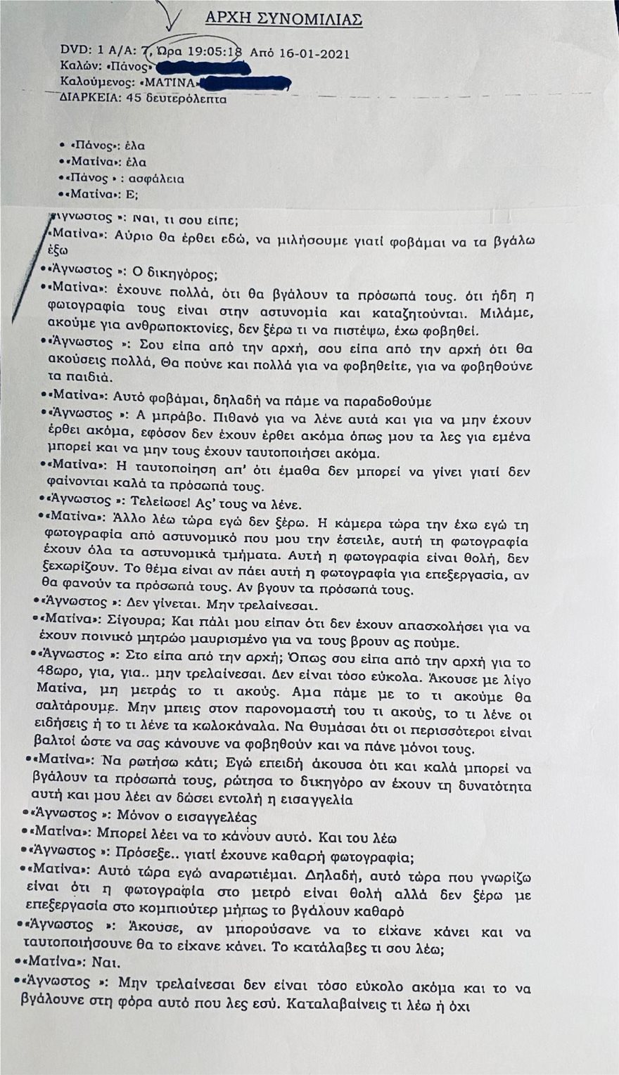 Με τα δύο λοιπόν αυτά άτομα μάλιστα, υπάρχει χρονικά προγενέστερη κατά πολύ επικοινωνία μαζί τους από εμένα και ταυτόχρονα δόθηκαν σαφέστατες οδηγίες που σκοπό είχαν την απόκρυψη των δύο ανήλικων δραστών. Μάλιστα ο «προϊστάμενος», πρόκειται για άνθρωπο μεγαλύτερο σε ηλικία από εμένα και με πολύ πιο σημαντική θέση σε σχέση με εμένα, ο οποίος προσπαθεί σκόπιμα να τους συγκαλύψει, ενώ ο δεύτερος εξ’ αυτών, ονομαζόμενος ως Πάνος, κάνει βόλτα γύρω από το σπίτι των δραστών με τη μηχανή του προκειμένου να διαπιστώσει την παρουσία αστυνομικής δύναμης και συγκεκριμένα της Ασφάλειας. Αν μάλιστα στις καταγεγραμμένες τηλεφωνικές συνομιλίες έχουν καλέσει οι ίδιοι την μητέρα, αυτό σημαίνει ότι αυτοί είναι ήδη ενήμεροι ενώ εγώ ενημερώθηκα μόλις την Παρασκευή (σ.σ εννοεί την ημέρα της σύλληψης των δύο ανηλίκων)».