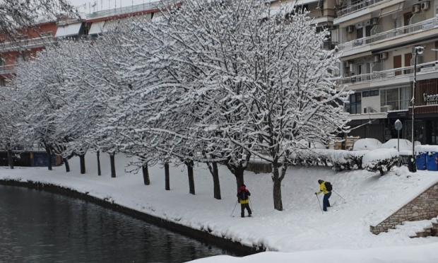 Το χιόνι στο κέντρο της πόλης φτάνει τα 10 εκατοστά και σύμφωνα με το trikalavoice.gr δύο τολμηροί πήραν τα σκι τους και έκαναν κατάβαση στις όχθες του Ληθαίου ποταμού.