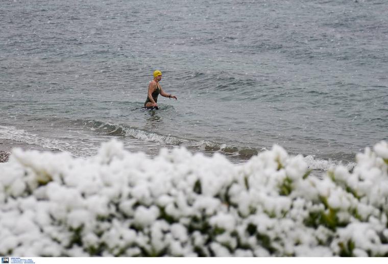 Ωστόσο, υπάρχουν και οι θαρραλέοι που δεν λογαριάζουν κακοκαιρία και χιονιά και βουτούν στη θάλασσα για το καθιερωμένο τους μπάνιο.