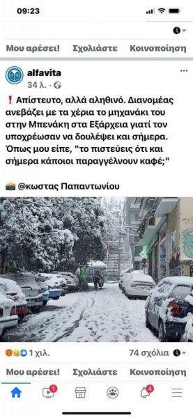 Η χώρα μπορεί να έχει μπει στην κατάψυξη και η Μήδεια να σαρώνει τις περισσότερες περιοχές της Ελλάδας, ωστόσο δεν έλειψαν και οι εικόνες με διανομείς να μεταφέρουν καφέδες και φαγητά.