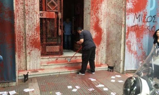 Εκτός από τα γραφεία της ΝΔ (ΦΩΤΟ κάτω), οι δράστες επιτέθηκαν με μπογιές, σπρέι και τρικάκια στα Δικαστήρια, το Δημαρχείο και το Ρολόι της πόλης.