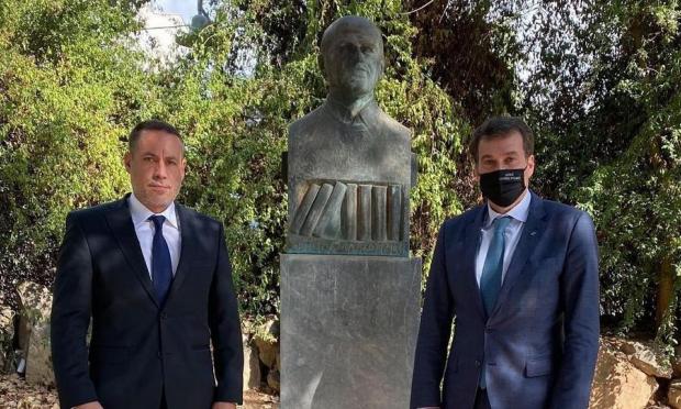 Στη φωτογραφία που συνοδεύει την ανάρτηση, ο δήμαρχος είναι μαζί με τον Κωνσταντίνο Μαλεβίτση, γιό του μεγάλου φιλοσόφου μπροστά από την προτομή του τελευταίου, που βρίσκεται στη Φιλοθέη απέναντι από το Λύκειο.
