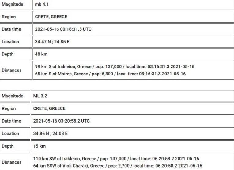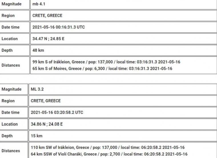 Ο πρώτος σεισμός, μεγέθους 4,1 Ρίχτερ, σημειώθηκε στις 03:16 τα ξημερώματα με επίκεντρο 51 χλμ Νότια – Νοτιοανατολικά του Τυμπακίου Ηρακλείου Κρήτης και εστιακό βάθος 25 χλμ. Στις 06:20 το πρωί, έγινε σεισμός έντασης 3,2 Ρίχτερ με επίκεντρο 3 χλμ Νοτιοδυτικά της Γαύδου και εστιακό βάθος 10 χλμ.
